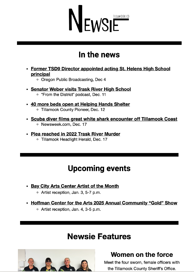 Tillamook County Newsie is a curated newsletter of local news, events and happenings in Tillamook County. Newsletters feature links to local stories, information on upcoming community events, and original Newsie Feature pieces.