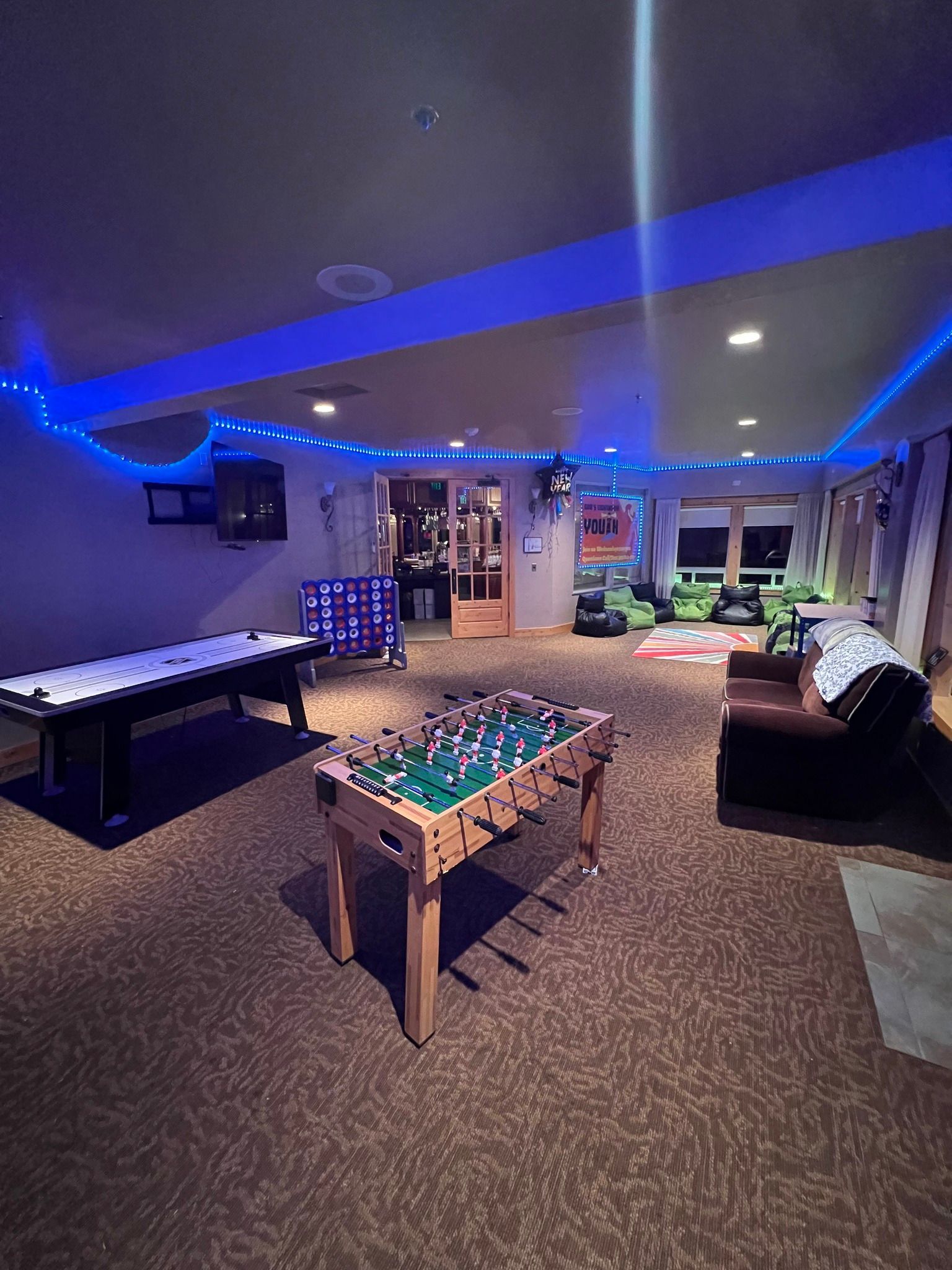 In addition to their main dining room, the Bunker Grille and Event Center also has two rooms that can be booked for events. One of the spaces is designated the “game room” and features foosball, air hockey, and plenty of comfy seating.